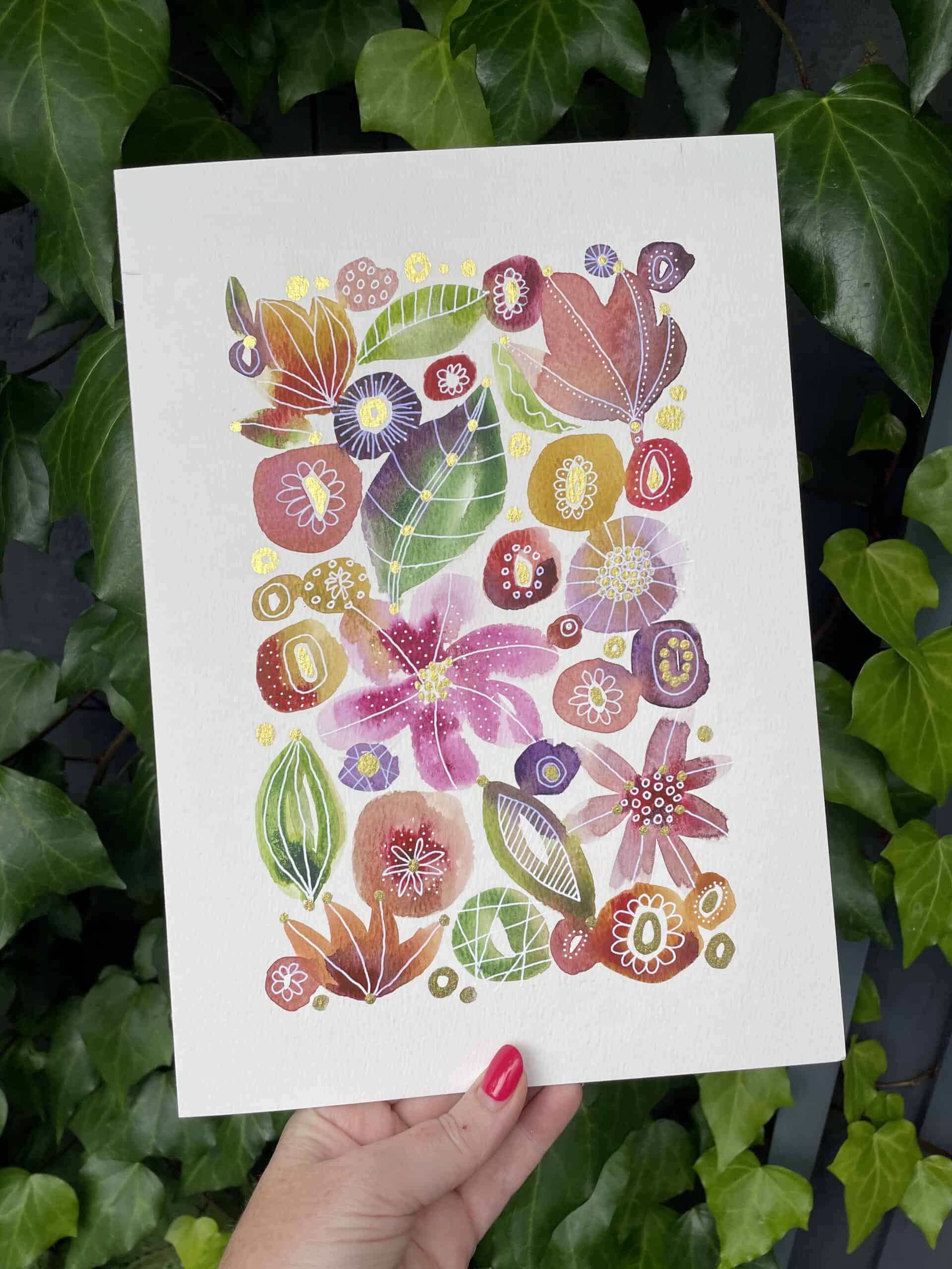 In this workshop you’ll use the fluidity of watercolours to create abstract florals and botanicals inspired by the gardens at Toolerstone, learning how to create pleasing colour palettes and techniques to add texture and depth. Once dry we’ll work into these pieces with a variety of mixed media tools including inks, metallics watercolours, and paint pens to add sparkling highlights and added details and embellishment