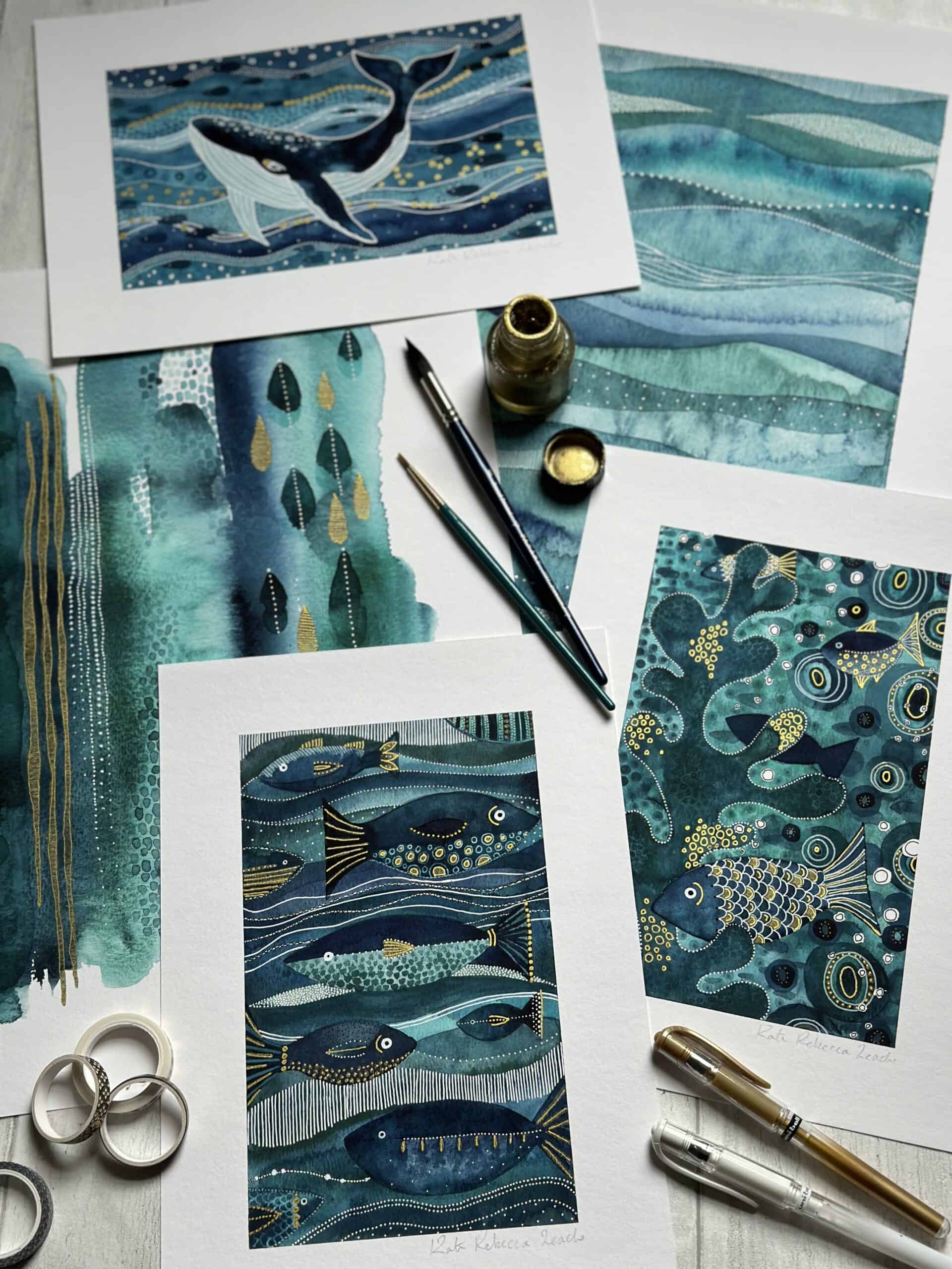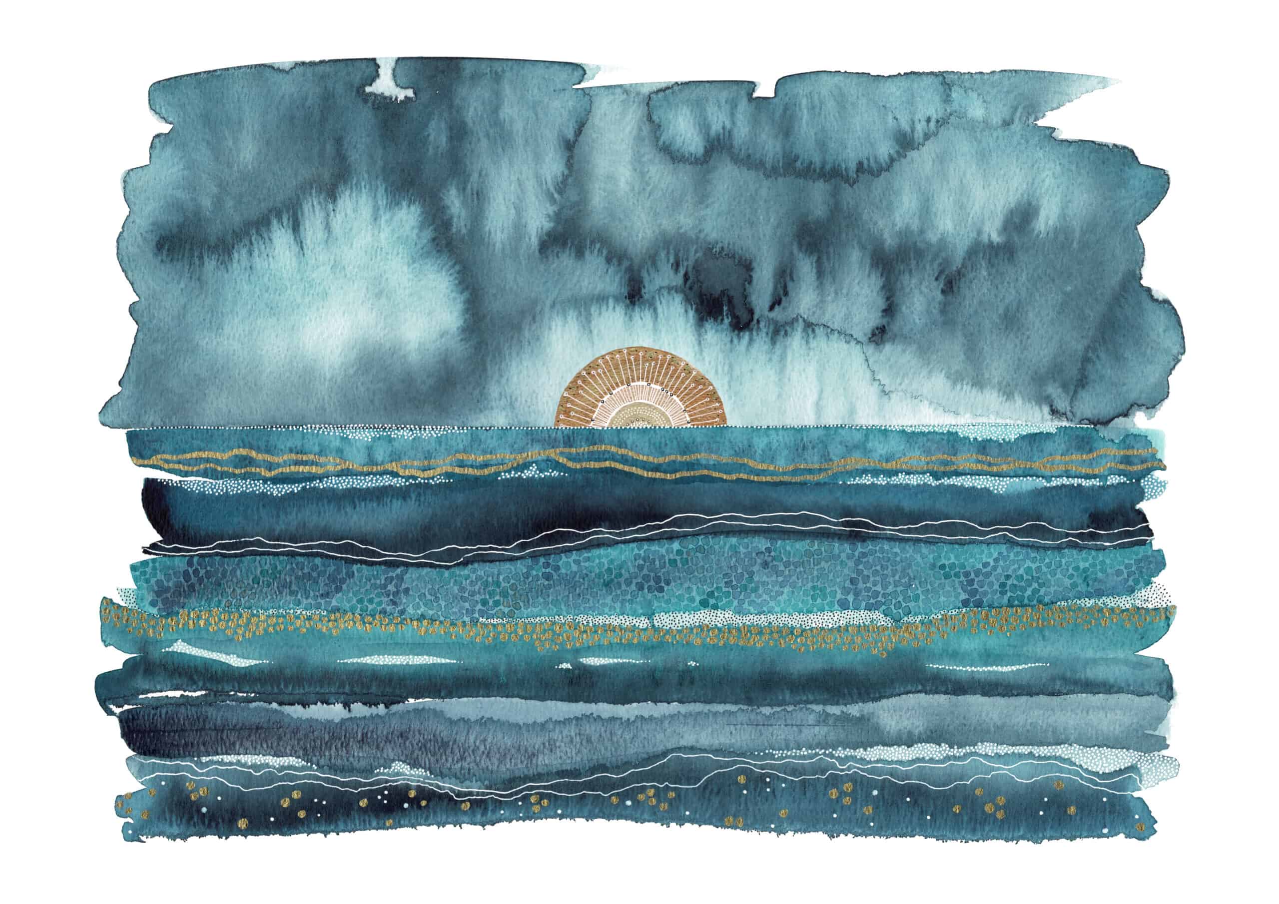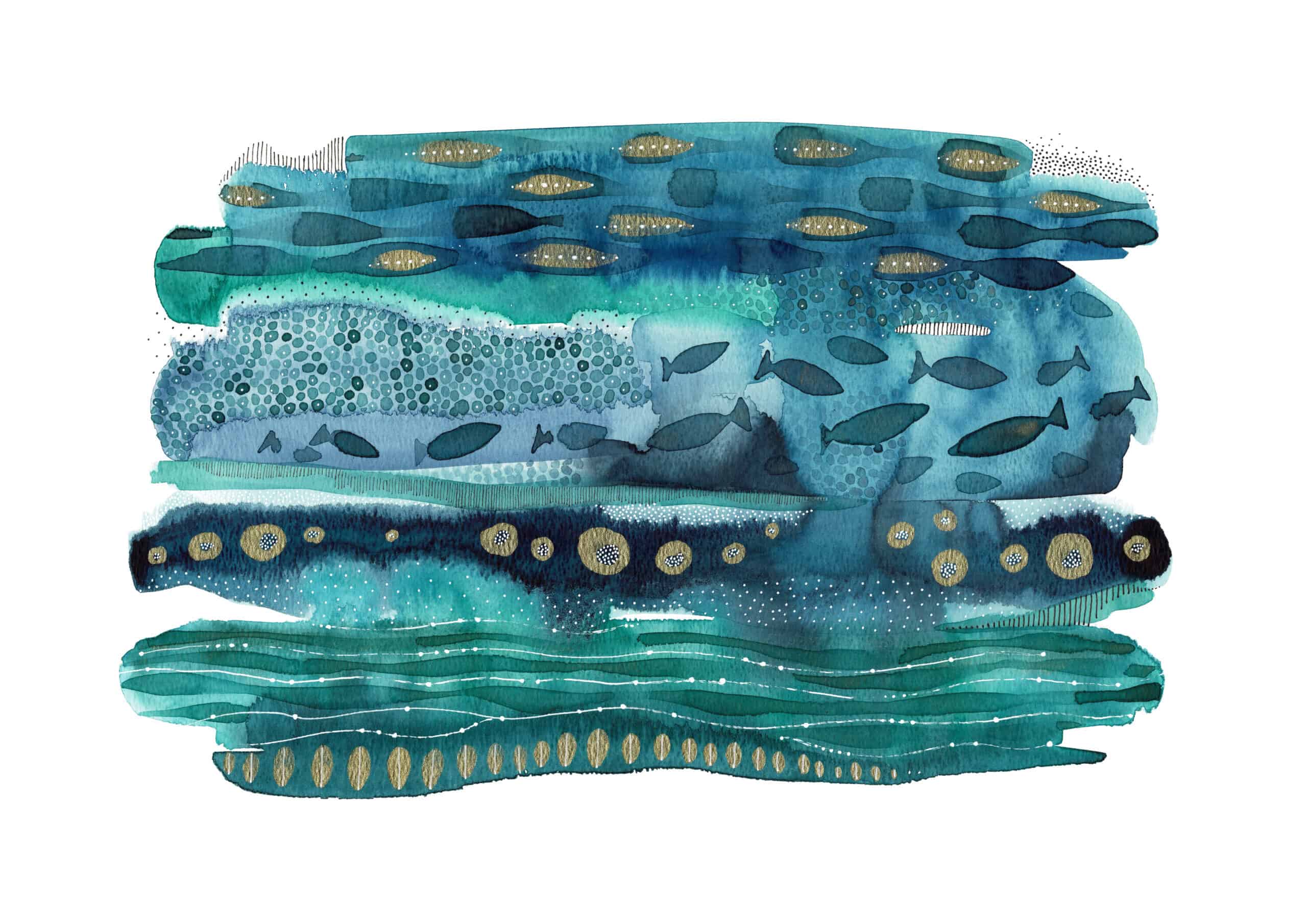 In this workshop you’ll use the fluidity of watercolours to create vibrant abstract seascapes, learning how to create pleasing colour palettes and techniques to add texture and depth. Once dry we’ll work into these pieces with a variety of mixed media tools including inks, metallics watercolours, and paint pens to add sparkling highlights and added details and embellishments.