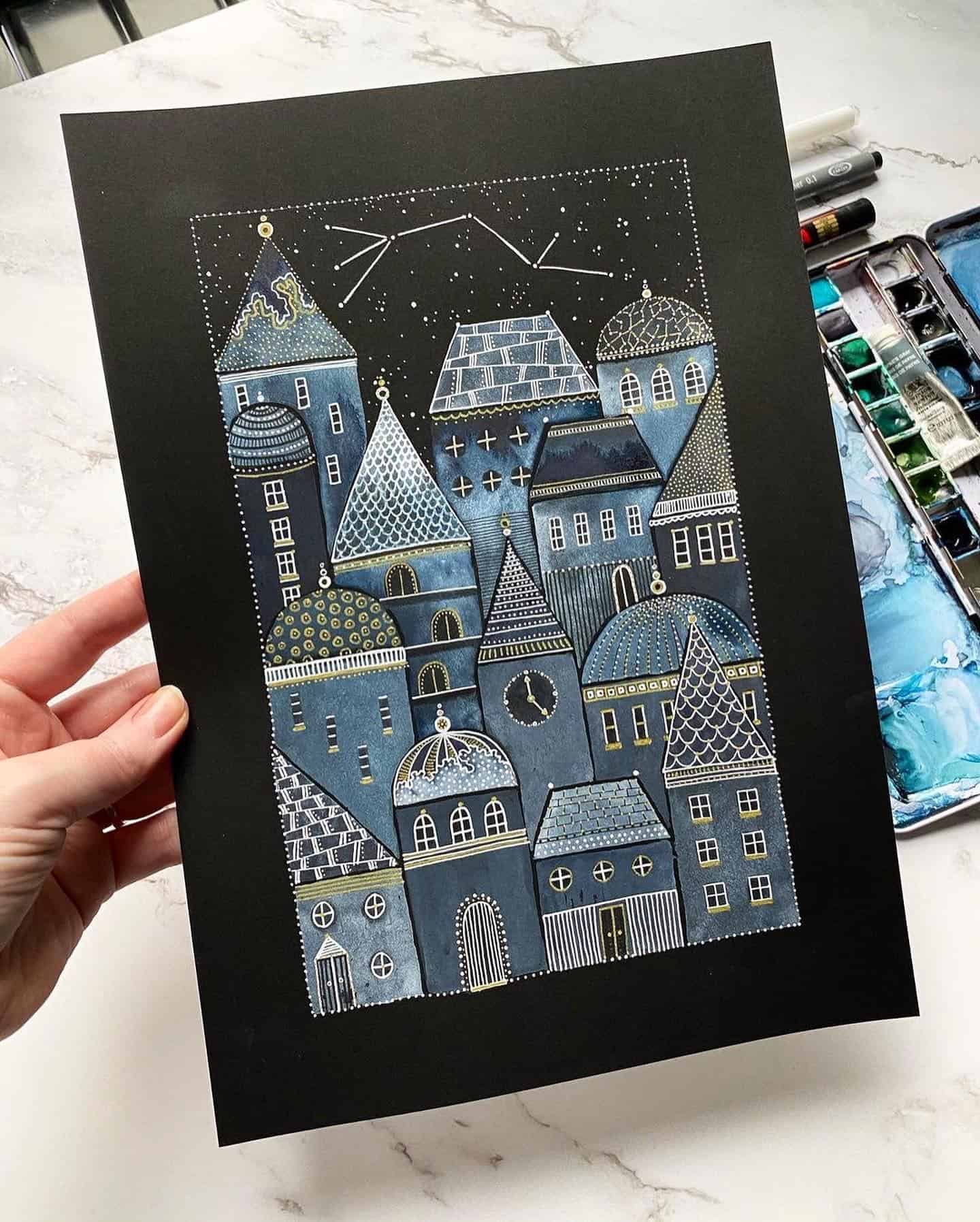 Little Towns and Houses–Learn how to create simply geometric shapes and how to transform them into sweet little houses. You’ll create a watercolour artwork inspired by villages and towns, perhaps from imagination or from a favourite holiday destination. From starry skies to sunsets you’ll be armed with the tools to make your painting come alive!In this workshop you’ll learn how to use organic watercolour shapes to form decorative water colour designs in a colour palette of your choice. You’ll learn various techniques and decorative ideas to help you create your very own, unique piece that combines watercolour, inks details, and accents of metallics. You can use inspiration from your own imagination as wellKate’s own portfolio of designs and patterns.